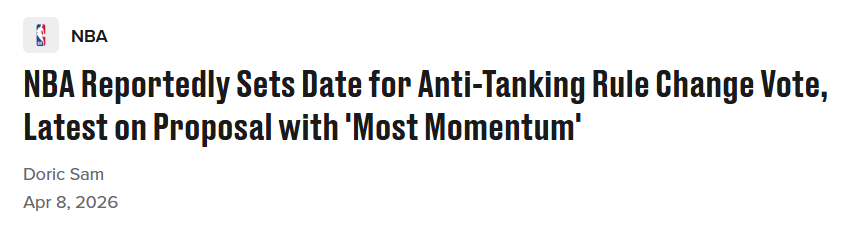 北京时间4月9日,NBA已确定正式着手解决联盟长期存在的摆烂问题的日期。据名记Shams报道称,联盟董事会预计将于5月29日(北京时间,下同)就反摆烂规则改革提案进行投票。