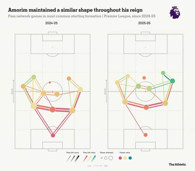 下面是阿莫林任内,曼联两个赛季的传球网络图。